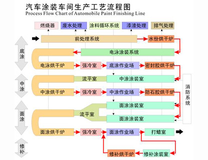 調(diào)漆室、油漆材料放置區(qū)、噴漆室、烘干房、增壓室、強冷室、空調(diào)供風系統(tǒng)、空氣供應(yīng)系統(tǒng)、無塵室區(qū)。